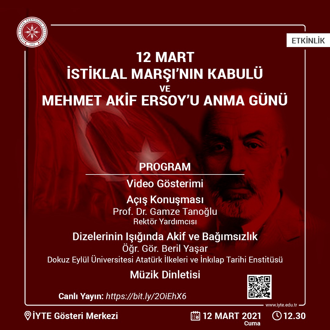 12 Mart İstiklâl Marşı’nın Kabulü ve Mehmet Akif Ersoy’u Anma Günü sebebiyle anma programı düzenlenecektir. İstiklal Şairimiz Mehmet Akif Ersoy başta olmak üzere istiklal mücadelemizin tüm kahramanlarımızı anacağımız etkinliğe tüm İYTE’liler davetlidir.