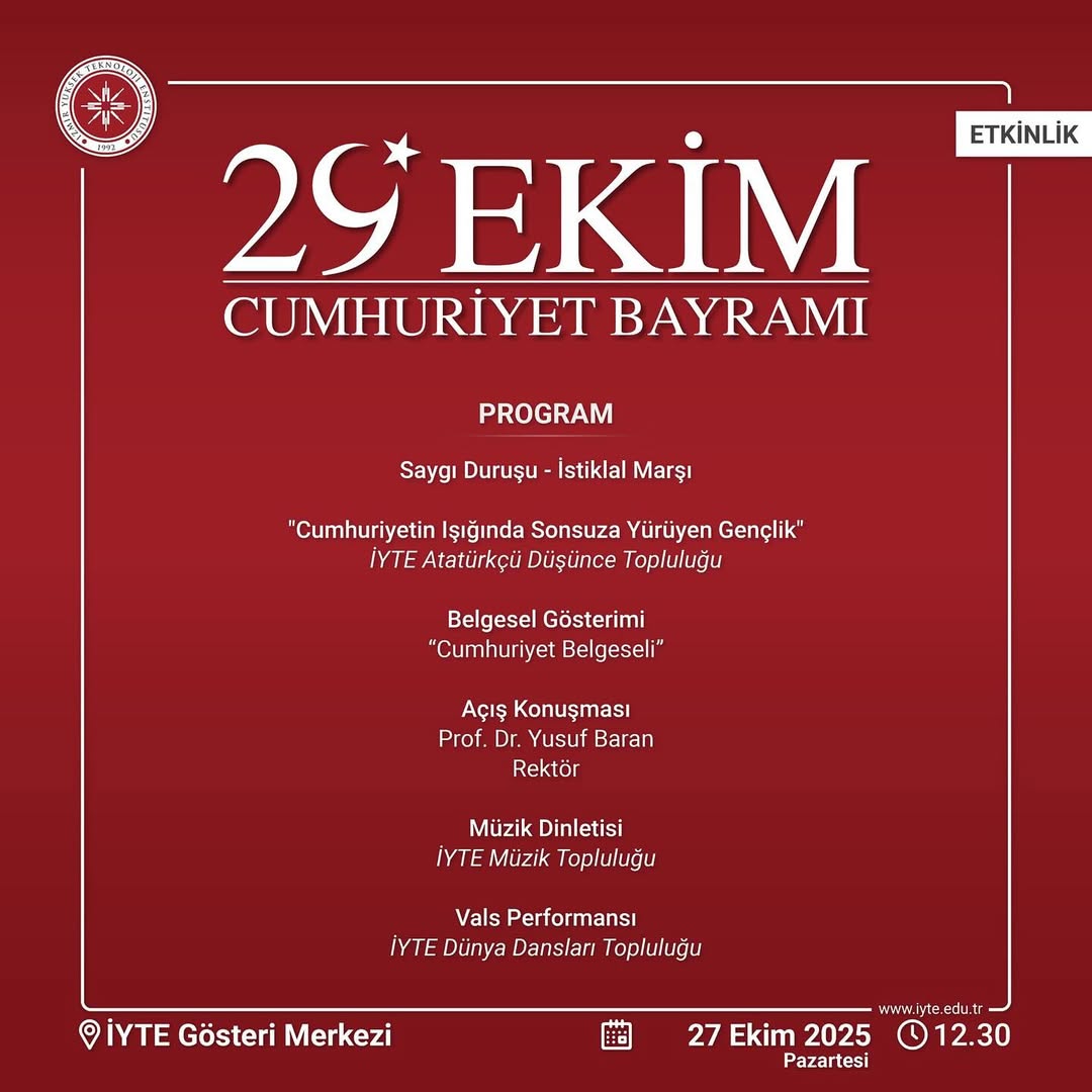 Cumhuriyetimizin kuruluşunun 102. yıl dönümü vesilesiyle 27 Ekim 2025 Pazartesi günü İYTE Gösteri Merkezi’nde düzenlenecek “29 Ekim Cumhuriyet Bayramı Programı”na tüm İYTE’liler davetlidir.