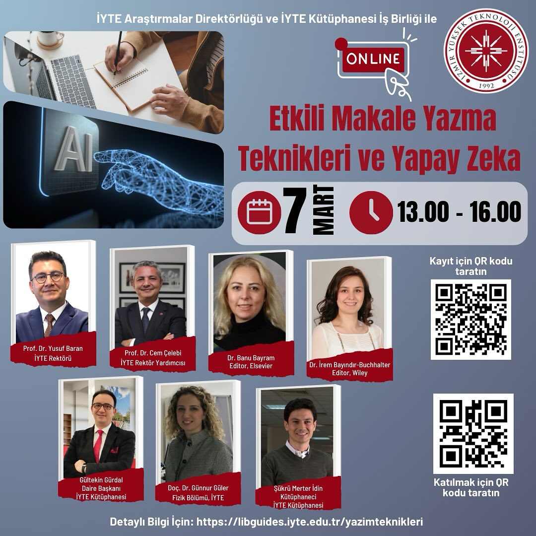 İYTE Araştırmalar Direktörlüğü ile İYTE Kütüphanesi iş birliğinde 7 Mart Cuma günü çevrim içi düzenlenecek “Etkili Makale Yazma Teknikleri ve Yapay Zeka” başlıklı çalıştaya tüm İYTE’liler davetlidir. Bilgi ve kayıt için: